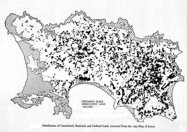 The number and extent of orchards is the most impressive single item of information to be had from the map of 1795. Orchard land accounted for no less than 15.5% of the whole island. It was widely distributed over the plateau, although much more thinly in the west than elsewhere, with a slight concentration in the west centre and a very dense distribution in the east. There were also patches of orchard on the slopes which bound the plateau, as for example in the south of St Lawrence, in Grouville and in St Clement; such sites enjoyed, among other advantages, a favourable aspect.