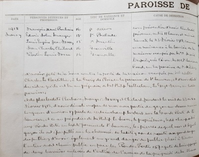 The young men all appear in the prison register for 1918 under the offence of theft and wanton damage. Francois, Louis and Edwin were sentenced to one month hard labour, with Jean and Celestin given lesser sentences of a fine or two to four days in prison.