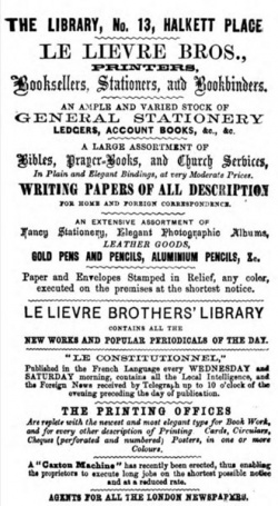 It is not entirely clear how the newspaper was run, but it appears that although Chadwick Le Lievre was shown in the census as its proprietor in 1861 and again in 1871, and was presumably also its printer, he may not have been involved on the editorial side. Indeed, in the advertisement from a contemporary almanac, the newspaper appears as the final element of his business, accorded far less prominence than his bookselling and library activities.