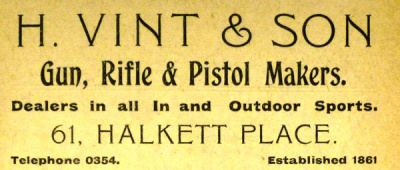 Henry Vint (1835- ), who came to Jersey from London, was shown in the 1891 census at 35 Halkett Place, working as a gunmaker. He was living with hiss wife Emma Elizabeth, nee Gee (1837- ), and three adult daughters. Also present in the household was Henry's older brother, also a gunmaker. The business was still in the same premises in 1895, according to the Jersey Times almanac, and by 1900 No 35 had been renumbered at No 16. Strangely the following year's census shows it as No 60.