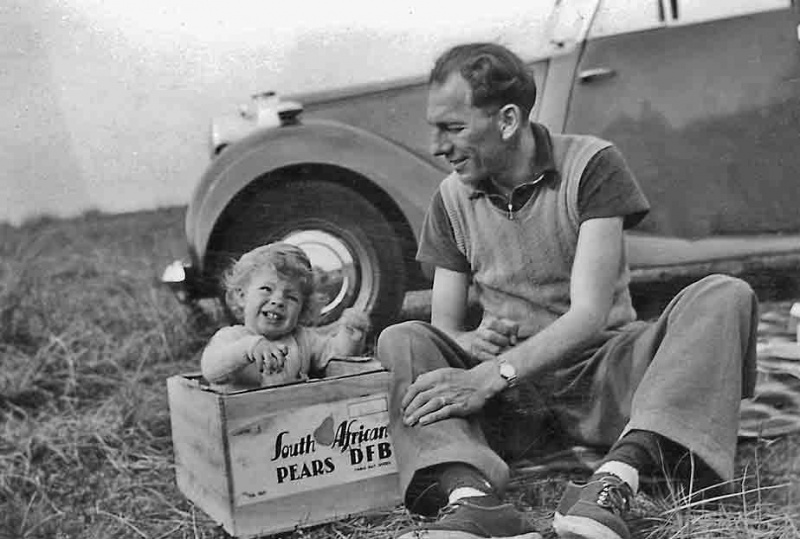 Mike Bisson in a fruit box with his father in 1951