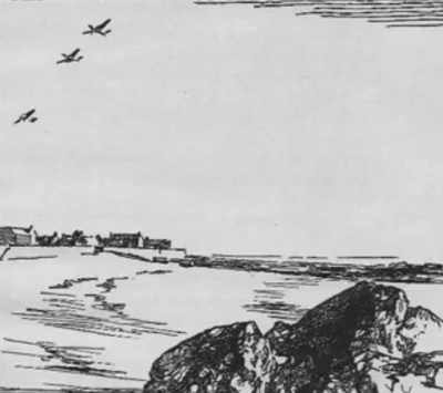 It was about 7 o'clock when Father and I were sitting in the garden and suddenly saw that Guernsey was being bombed - great volumes of smoke pouring out and sounds of gunfire. A few minutes later two German planes swooped over our headland and right over our house, machine gun firing all the time and making an awful row. Three bombers came close behind but did not drop any bombs. We hadn't time to get inside, and fortunately no bullets fell on us and they were soon out of sight.