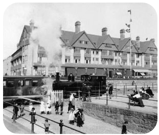 A train halts at West Park Station, opposite the Grand Hotel