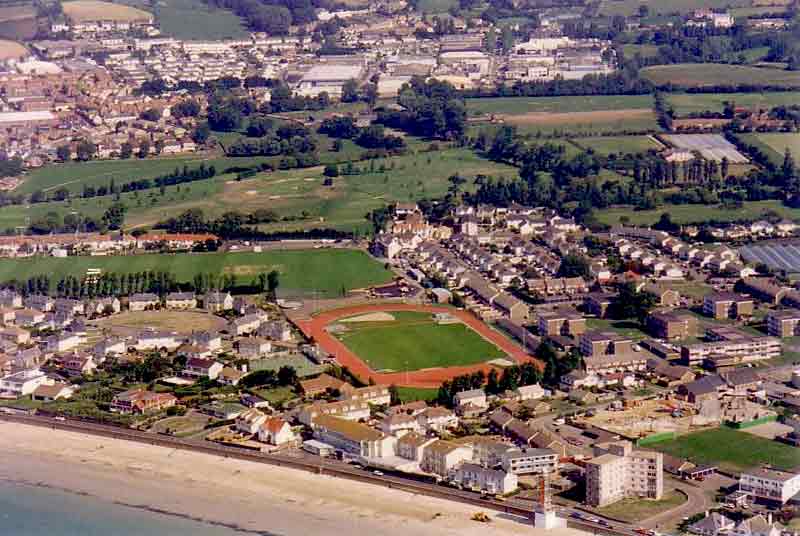 Les Quennevais playing fields with Belle Vue go-kart track behind yet to be developed for housing in 1996