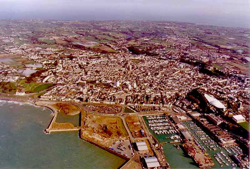 St Helier stretches out behind the Esplanade with People's Park and Victoria Park on the far left