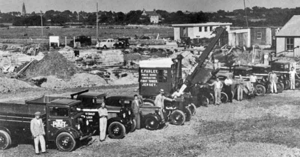 Work is now proceeding rapidly at the new Jersey Airport, which is situated near St Peter's Barracks and within ten minutes' walk of St Peter's Church. Pipes are being laid for drainage, and a new road on the north side is being made to replace the one which has been absorbed in the airport area. The radio station, of course, has been in working order for some time on the east side, near the road, and buildings, hangars and offices will be erected nearby.