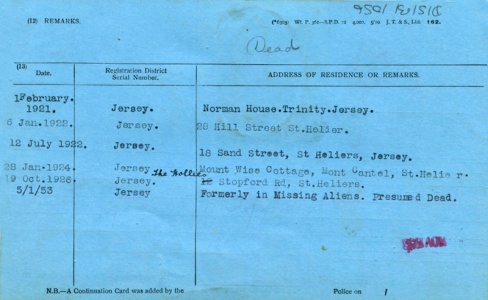 These records are now held by Jersey Archive and those relating to people born in or before 1917 have been made public. Access to images of the registration cards is restricted to subscribers to the Archive's online service, but basic details are accessible without a subscription.
