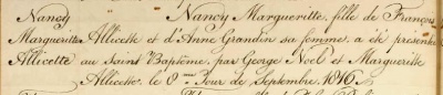 Beautiful copperplate writing for the baptism record of Nancy Margueritte Allicette at St Saviour on 8 September 1816