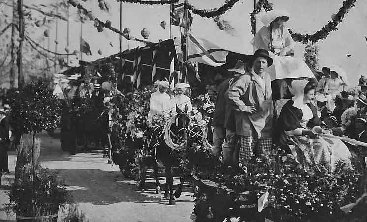 The Jersey Battle of Flowers first took place in 1902 as part of the celebrations for the coronatin of Edward VII. There are many pictures in existence of the Battle that year, and in subsequent years, and Jerripedia has a substantial collection in its gallery, including at least one from all the early years. Few, however, are of the quality of this picture from 1909, when decorated horse-drawn carriages paraded one after the other in front of the spectators' grandstands. Unfortunately we do not know who took the photograph, but it is likely to have been one of the island's professional photographers of the time, possibly Albert Smith, Francis Foot or Percival Dunham