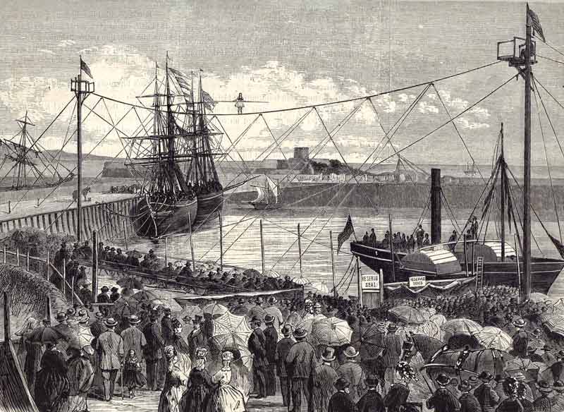 Maria Spelterini (1853-1912) was an Italian tightrope walker, the first woman to cross the Niagara Falls in 1876. She also crossed again blindfolded, manacled, and with peach baskets strapped to her feet. She was known as the female “Blondin”. Details of her earlier appearance in Jersey are very limited. Her appearances at St Aubin in 1872 were to help the small harbour maintain its status as a busy and thriving part of the island and support the railway link with St Helier. She put on several performances, some of which included illumination and fireworks. This was at the start of her career. There is little detail of her exploits before her performance in Jersey, but it is known that she also performed in St Petersburg, Moscow, and Catalonia.