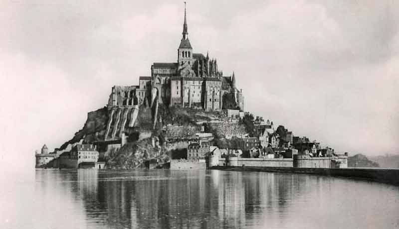 This is Mont St Michel, just off the French coast in the corner of the Baie de Mont St Michel, where Brittany and Normandy meet. It has strong historical connections with Jersey. During the 11th and 12th centuries, before the Channel Islands became separated from the Duchy of Normandy, the Abbey of Mont St Michel had strong connections with several of the island’s churches, and derived a considerable income from them. In 1168 Philippe de Carteret gave the church of St Ouen to the Abbey. As late as 1254, Henry II confirmed that the monks were entitled to wreckage which washed up on their Jersey lands. Many important ancient records relating to Jersey have been discovered over the years at the Abbey. This superb picture, shows the causeway which has connected the islet to the shore for many years, and which is in the process of being removed so that the mount once again becomes an island at high tide. We have chosen this image as our picture of the week to introduce a new feature to Jerripedia – historical pictures of towns in Normandy and Brittany with which Jersey has links, including the twin towns of the 12 Jersey parishes. Go to our Normandy and Brittany pages for links to the new galleries
