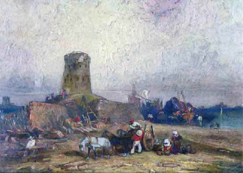 This is the earliest known picture of Le Hocq Tower, one of Jersey's round coastal towers which were built to protect the island from invasion by the French in the late 18th and early 19th centuries. Le Hocq's tower had not been built in 1781 when the French successfully invaded the island just up the coast at La Rocque, leading to the Battle of Jersey. This painting in by W C Stanfield, and it dates from about 1840. It has been in the gallery of pictures of Jersey's coastal towers for some time, but we have now acquired this much better quality image.