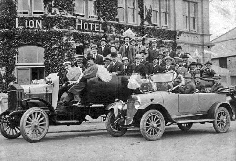This magnificent photograph of a heavily laden charabanc and a motor car parked outside the Lion Hotel is something of a mystery because we do not know where the Lion Hotel was, and we do not know exactly when the picture was taken. Photographs of charabanc outings are very common, because they attracted professional photographers keen to sell copies of their work to those on the outings, but photographs of motor cars of the same vintage are much rarer, and the combination of the two is unique in the Jerripedia archive. Update: Mystery solved. The establishment has been identified as the Red Lion Hotel in Belgreve Bay in Guernsey, which explains why the Jerripedia editors could not place it in Jersey. It's such a grand photograph, however, that it deserves its brief moment of glory by being retained as our picture of the week