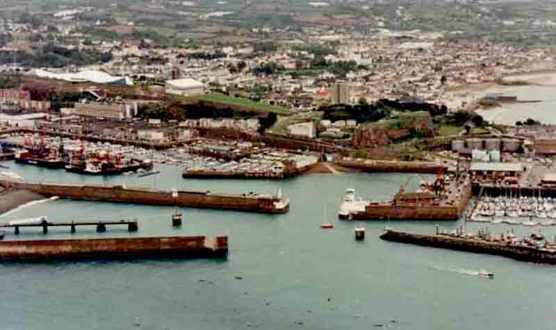 This aerial photograph of St Helier Harbour, taken some time in the 1990s, is not of the best quality, but it vividly indicates how the island's main port has grown over the years. The original harbour, bounded by Commercial buildings, La Folie, South Pier and the New North Quay, is in the left centre of the photograph. This section of the port dries out completely at low tide and contains the original English and French Harbours and what is now known as the Old Harbour. Today these harbours are used exclusively for leisure craft. Moving out towards the camera we see the Albert and Victoria Piers, built during the 19th century and for over 100 years the outer limits of the harbour. In the late 20th century there was further expansion to create Elizabeth Harbour, a roll-on roll-off terminal in the left foreground, which is today the main centre of activity for both cargo vessels and passenger and car ferries. To the right is the slightly earlier marina, with an industrial complex behind on reclaimed land. Out of shot on the right is the berth specially for tankers delivering fuel to the island.