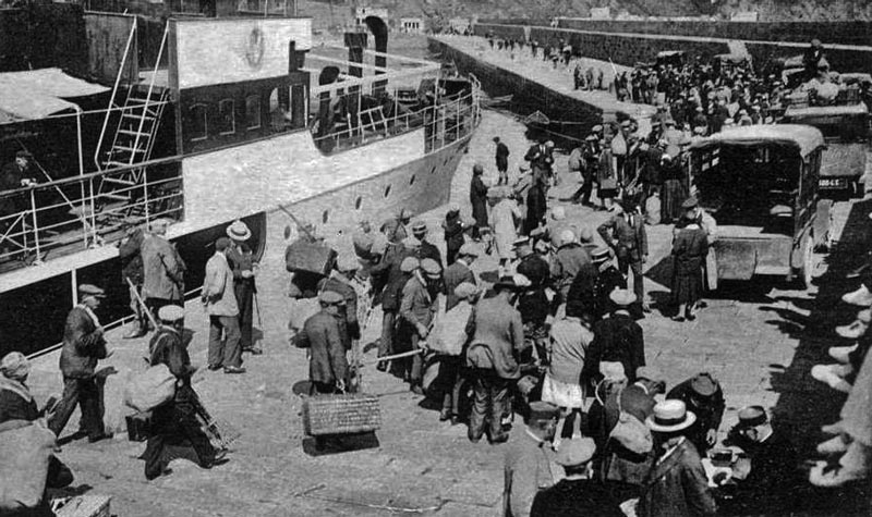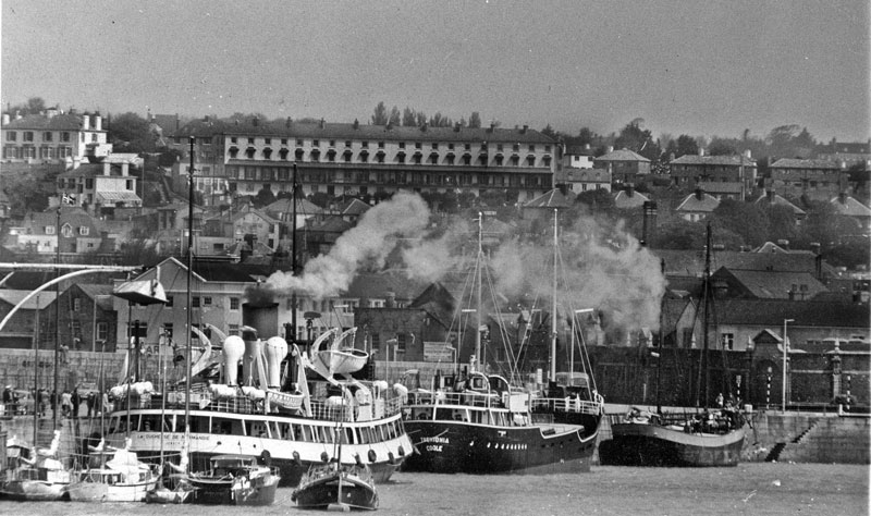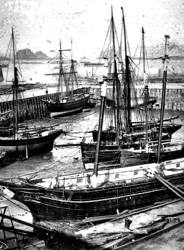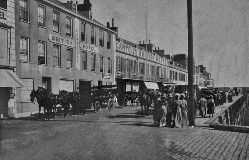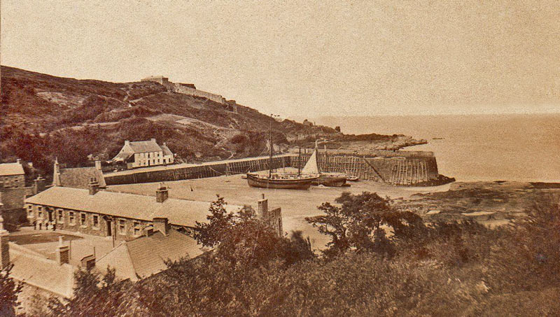 We featured the photograph on the left as our weekly selection at the end of March this year, and suggested that it might be the oldest surviving outdoor photograph of Jersey. Now a slightly different version of what appears to be the same photograph has surfaced in France, where it is offered for sale at 65 euros. It is described as circa 1870. We believe, however, that the photograph was probably taken some 20 years earlier. Both images were obviosly taken from the same viewpoint, within a short time of each other, but a close inspection confirms that they are, in fact, different photographs, with very minor differences, including the stance of the figure on the edge of the pier behind the ship in the centre of the picture, and the appearance of a dog on the harbour bed in the left-hand picture, but not the earlier one. The wider view to the left, shown in the newly acquired picture on the right, confirms that this is not the French Harbour as we believed when the earlier picture was used in March, but, as was soon suggested suggested to us, the adjoining English Harbour, with the area known as La Folie on the left. The pierhead behind in the centre left of the image is, therefore, not Victoria Pier but South Pier. If anything this picture is of lesser quality than the other, but it confirms that there is