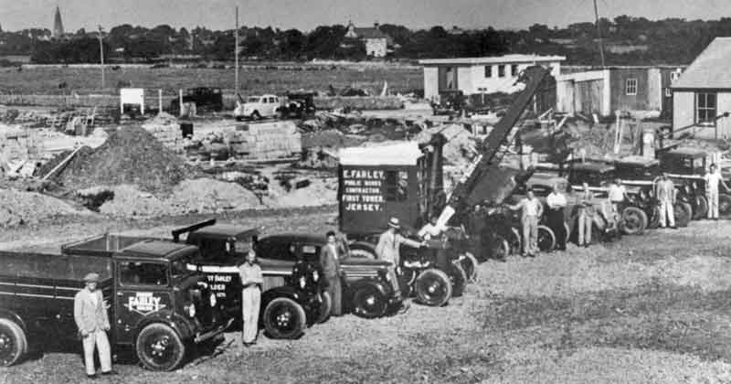 The new States Airport in 1937, and below, the grass surfaces used as the first landing strips, with St Peter's Barracks in the foreground. It can be seen in the picture below that the main landing strip in use when the airport opened was across the picture from left (north) to right (south) and right to left, depending on wind direction. As the entire surface was grass, the direction of landings and take-offs could be adjusted to cope with crosswinds. Today's single runway is aligned approximately due east and west. When the airport first opened, the land behind and to the left of the terminal building, on which the eastern end of the main runway would be built, and which is today all within the Airport boundary, was still in private ownership as cultivated fields