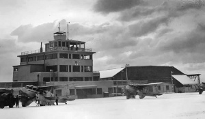 An aerial view in 1937 with St Peter's Barracks in the foreground and the Airport terminal behind