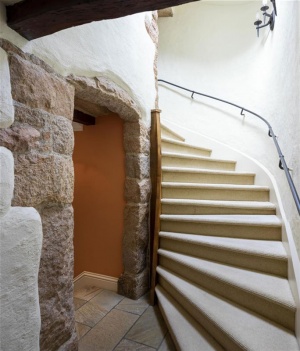 - "A tourelle staircase was reported for this house, [1]but would not have been suspected from the outside. The steps of the stairway are not monoliths, but composed of three or four pieces, and are now cemented over and painted. It is an example of late construction, perhaps about 1750. It supports the theory that the tourelle staircase continued to be constructed after the traditional round arched house went out of fashion.