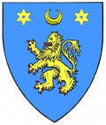 - Arms — Azure, a lion rampant, or; in chief a crescent between two mullets of the last