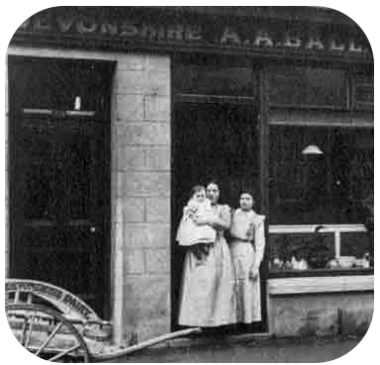 Arthur Archer Ball (1877-1946) ran Devonshire Dairy at 59 Great Union Road at the beginning of the 20th century. His wife, Kate Elizabeth, and baby daughter, Gladys Nora, are pictured on the doorstep, possibly with an employee, in about 1914. Arthur's father William (1824- ) and elder brothers John and Percy, also lived at the property in 1911. Arthur and his brothers were born in Jersey. Their father came from Cornwall, and Kate Elizabeth was from Plymouth