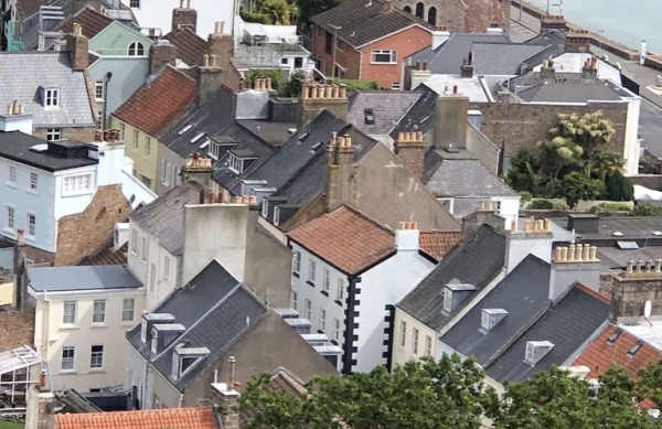 Looking down on St Aubin's High Street. Belle Ville is in the right foreground, the middle of three terrace houses with grey roofs, partly hidden by the tree