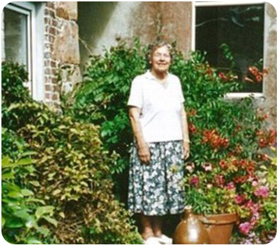 Adeline Mundy, outside her home, Bellozanne Abbey