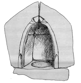 A hook of not less than 6in in length is held between the two front stones and may well have been used for suspending a vessel containing water (or possibly wine), but from the size of the hook one can only suppose that the weight of the vessel must have been substantial.
