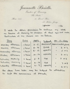 Jeannette Boielle, of The Studio, 56 David Place, was a popular dancing teacher in the 1930s and had to apply to the Germans for permission to continue their classes after the beginning of the Occupation. The left hand picture shows her application in English, that in the centre its translation into German, and on the right it the permit issued by the Feldkommandant's office [1]