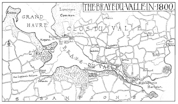 The Braye du Valle was the name for the body of water that separated the northern part of Guernsey, the Clos du Valle from the main southern part of the island. It ran from Grand Havre on the west coast through to St Sampsons Harbour on the east coast. The water level was shallow, and could be crossed on foot at low tide, and there were three crossing points: Pont Allaire (near the Vale Church), Pont Colliche]], and Grand Pont ("The Bridge") at St Sampsons Harbour, the name by which it is still known.