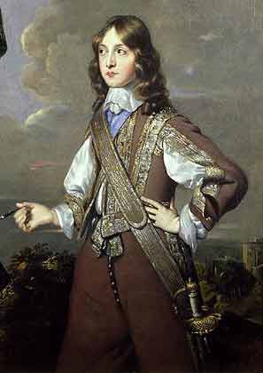 We hear of Sir Philippe de Carteret riding into the sea to meet his King, as he was compelled to do by the terms on which he held his Seigneurie. Then the next day all the horses, carriages and waggons and baggage were landed and the King and his brother, safe in Elizabeth Castle, had the pleasure of seeing the Parliamentary vessels prowling about the Castle too late to stop his landing. A large number of nobles and gentlemen were in the King's suite. The King was then about nineteen years of age, tall, with a good figure, a pale open countenance surrounded with a quantity of dark hair. He was dressed in a violet coloured coat, whilst all the members of his suite wore black.