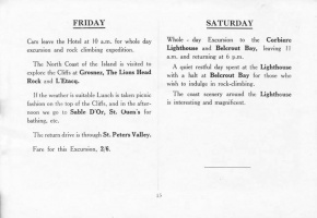 In addition to the daily free dances, the hotel offered its guests a weekly sports day on the beach at St Brelade, afternoon and all-day coach tours, day excursions to France, and a full programme of other events through the week, including rock climbing excursions and clifftop picnics.