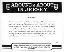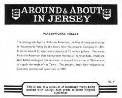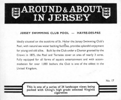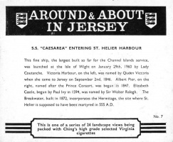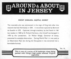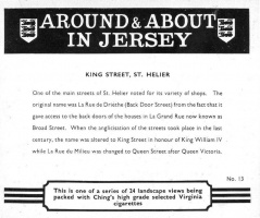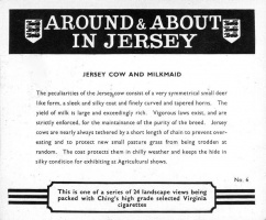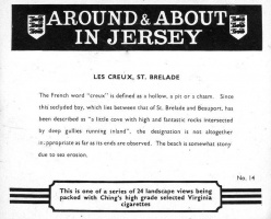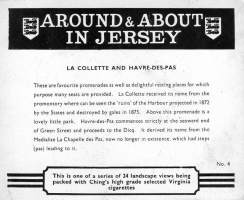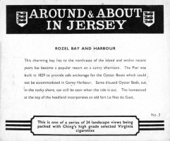Cigarette cards were originally blank, used to stiffen flimsy packets and protect their contents. Then manufacturers realised that they could insert printed cards, encouraging smokers to buy their brand to complete sets of cards. These cards were produced for Chings, Jersey cigarette manufacturers, in the early 1960s. They are not particularly good photographs, but collectively they do help paint a picture of the island at that time. The first selection of pictures here is from the first and second sets, issued in 1960 and 1961, respectively. Below them is an almost complete third set, together with the descriptive backs. Finally there is a set of coloured etchings from about a century earlier. The cards are not particularly valuable, a set in an original album selling today for about £5