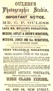 In 1872 his son Clarence was advertising a photographic business in the Jersey Express Almanac as "Ouless & Son's Photographic Establishment". Whether father and son were both active in the business, or this was simply an attempt to capitalise on the father's fame as an artist, is not known, but the year before and the following year the business was advertised under Clarence's name only.