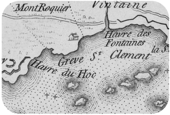 The name Le Hocq is derived from the Jèrriais word for headland. The beach to the west looking back to Rocqueberg is Havre des Fontaines, although it has also been known as Le Havre du Hoc and Havre ès Maques. Commander Richards of the Royal Navy produced a survey of the island, which shows the spring on the shore that gave the bay its name. The sandy beach to the east is called Havre ès Cabots