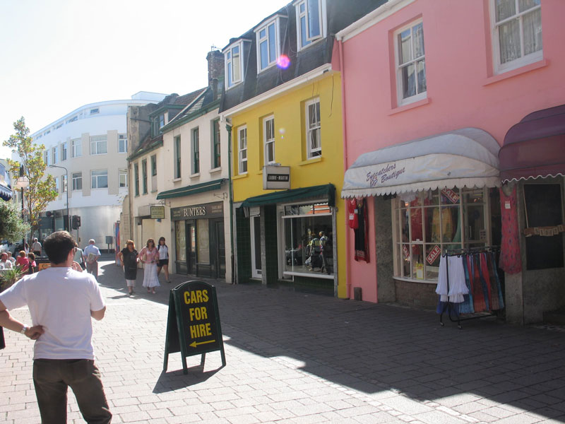 A pedestrianised section was created here, but further along traffic again joins Colomberie at the Grenville Street junction, being able to turn along the western section of Colomberie, or in the other direction along the start of Don Street to head east or around the town ring road.