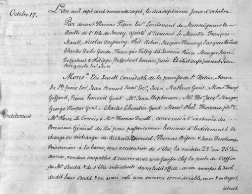 The Court record shows that he had ‘mal parlé de la personne sacrée de sa Majeste’ having on several occasions said: ”Damn the King” and ‘other seditious words’. He was sent to prison while the Court decided what to do with him, but there is no apparent record of the case being concluded.