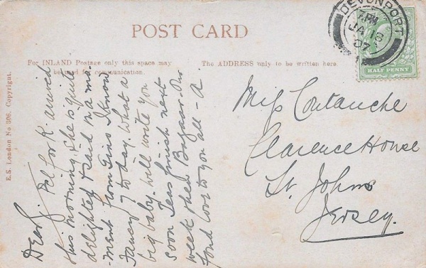 And a card sent to another Miss Coutanche in 1907. Normally the address and date would be sufficient to identify the recipient, but at the time there were three Miss Coutanches living at Clarence House. They were Virginia (1878- ), Eliza Mary (1881- ) and Annie (1883- ) and they were living with their unmarried brother John George (1867- ) and mother Eliza. Eliza was Eliza Boomer, the second wife of John Coutanche (1840- ). He was the son of builder Jean Coutanche and Nancy Cabot, and he became a baker. He married Mary Jane Boomer, sister of George, the first headmaster of La Moye School and founder of La Moye Golf Club, in 1866. John George was born the following year and Mary Jane died in 1869. Widowed John married again in 1871 to Mary Jane's younger sister Eliza, who was the mother of the three sisters. As far as we know none of the three ever married. John George carried on his father's business, working as a baker