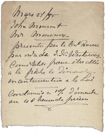 However, a search in the Pursuites Criminelles, a record of Royal Court criminal cases from 19 September 1797, revealed details of the cases against Thomas Bisson and Jean Deschamps, and separately James Collings and Thomas Parbut.