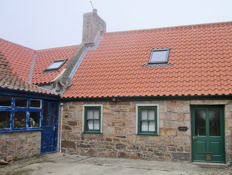 Single-storey, five-bay house with L-plan ranges of outbuildings, wellhead and detached bake house. Main cottage (currently called Bamboozie Cottage): single storey, attic, 5 bay, pitched pantile roof, dressed granite chimneys at ends with thatch stones, roof lights.
