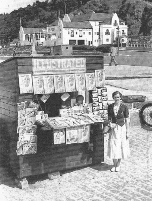 Iris de la Mare outside her newspaper kiosk at West Park in the late 1930s