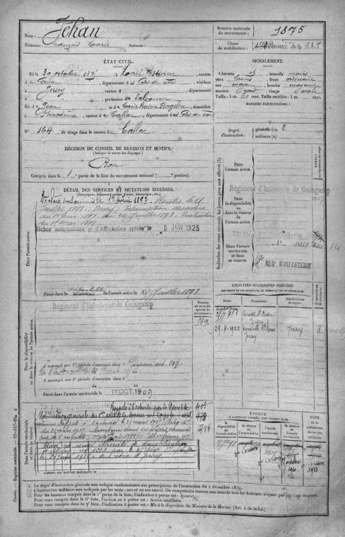 - 9 François Marie Le Jehan (1875-1940) (Mael-Pestivien) [1] m 1 Leonie Jehan (1869- )