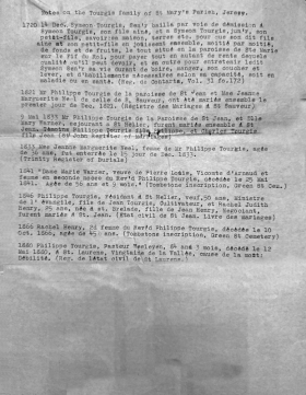- 3 Thomas Tourgis (1600-bef 1665) [2] m (1640, St O) Rachel Le Gresley [3], daughter of Jean, (son of Francois and Madelaine, nee Le Brocq) and Jeanne, nee du Heaume