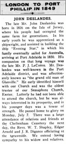 At the age of 93 years, Mr John Deslandes, of Penny Street, Semaphore, died this morning after a long illness. For many years he had enjoyed the title of ‘The Grand Old Man of Glanville’ and was one of the best-known figures in Port Adelaide district.