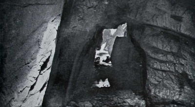 At high tide the cave floods and water is forced through the tunnel and out of the hole, creating a booming noise, which is a feature of many St Mary legends.