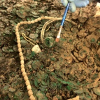 At first it appeared to be a thick, tightly curved gold torc but when cleaned back a bit it was revealed as a pair of solid gold “wheels” at the end of a thick, curved, gold torc collar. The wheels are about 4cm accross and the collar part about 15mm thick. We’ve now cleaned back enough coins to see that the torc appears to be constructed from two semi circular parts which would have fitted together to be worn. We’ve think we’ve exposed about 90% of the first part with the wheels and about 50% of the second. We don’t know what the other ends of both are like yet. The sheer size of this piece is amazing in comparison to everything else we’ve seen yet and the torc surface appears to be in good condition and of a very pure gold.