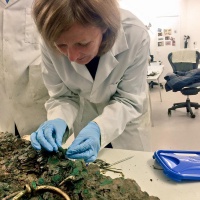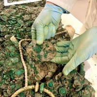 Conservator Neil Mahrer separating coins from the giant mass unearthed in a Jersey field