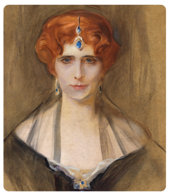 Elinor began writing in 1900, starting with a book based on letters to her mother. She began having affairs with various British aristocrats. Her Three Weeks, about an exotic Balkan queen who seduces a young British aristocrat, was allegedly inspired by her affair with Lord Alistair Innes Ker, brother of the Duke of Roxburghe, and scandalized Edwardian society. She had a long lasting affair between 1906 and 1916 with Marquess Curzon of Kedleston. She was famously painted by society painter Philip de Laszlo at the age of 48. The painting was apparently commissioned by Lord Curzon, who also gave her the sapphires she was wearing in the portrait.