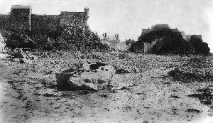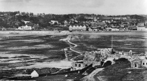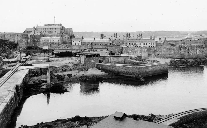 These two photographs were taken around 1872, when work was under way to construct a new and massive harbour for St Helier. One arm was built out from Elizabeth Castle, bridging the gap to the Hermitage Rock and then heading out to sea. That was completed. The other arm, from La Collette, was repeatedly damaged by winter storms before much progress could be made and the whole project was abandoned. These picture were taken while work was under way outside the castle and show temporary buildings which were part of the construction site. In the foreground on the left is a large basin which was probably the inner section of the castle's harbour, little of which now remains. It appears that a retaining wall was built to keep the tide out and the whole area was soon filled in, as shown on the right, to create an open space where the giant blocks which would be used to build the breakwater could be constructed and stored