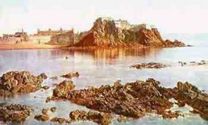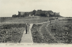 Elizabeth Castle. About half a mile out to sea from St Helier lies an islet 60 yards broad and about 500 yards long, which can be reached at low tide by a causeway of shingle across the sands. For 400 years this contained a priory, and for the last 350 years a castle.