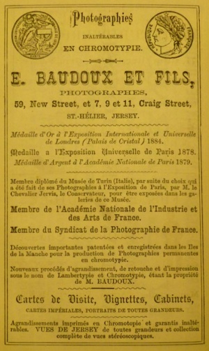 Originally from France, Ernest Baudoux (1828-1897) worked in Jersey from 1869 at 11 Craig Street and 51½, 56 and 59 New Street. In 1885 he was joined in business by his son, but two years later they sold out to John Stroud, a young photographer from London, who in turn sold his business, including many of Baudoux's glass-plate negatives, to Albert Smith. Some of these photographs have been attributed incorrectly to Smith and the Photographic Archive of La Société Jersiaise have a project under way to attempt to correctly identify who took each of the 3000-plus images in their collection attributed to Smith.